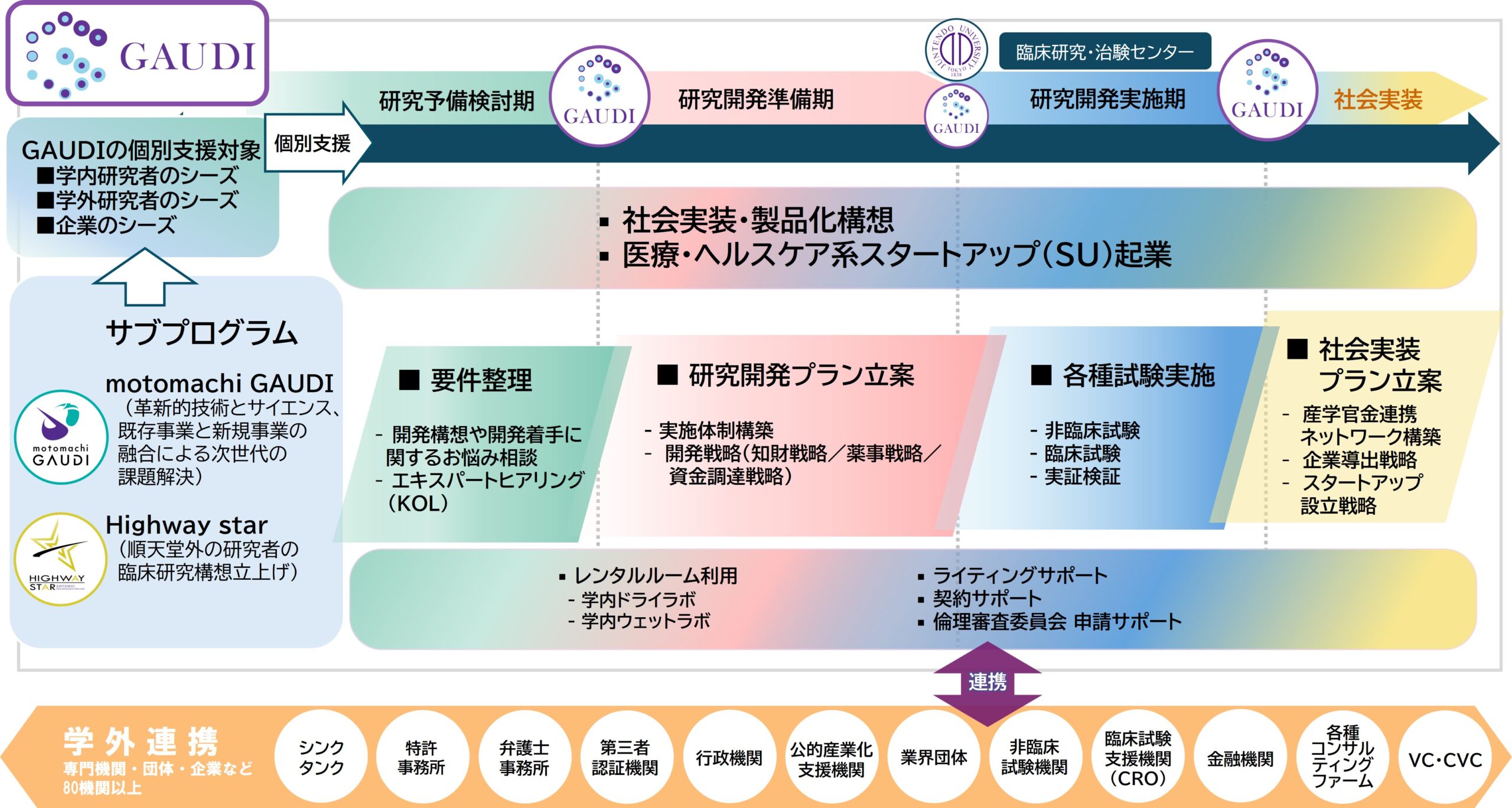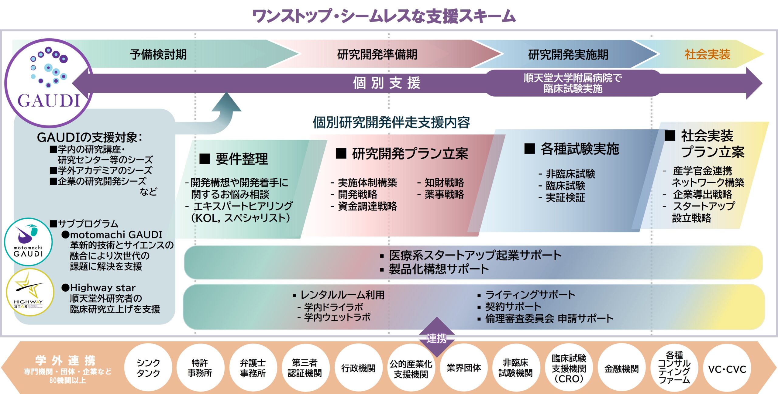 2019年に始動した、オープンイノベーションプログラム「GAUDI」は、順天堂大学が有する大規模臨床プラットフォームを活用し、開発導入ステージから実用化・事業化ステージまでをワンストップで伴走支援する会員制の社会実装支援プログラムです。