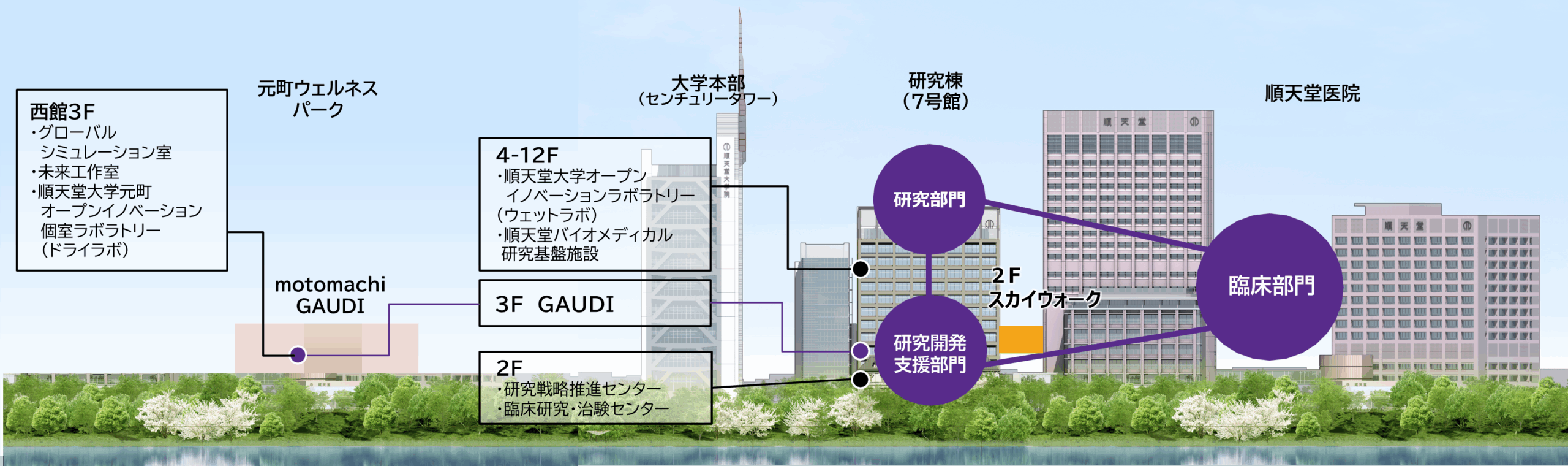 順天堂大学(本郷・お茶の水キャンパス)は、臨床部門(順天堂医院)と研究開発部門(研究棟:7号館)が隣接しています。