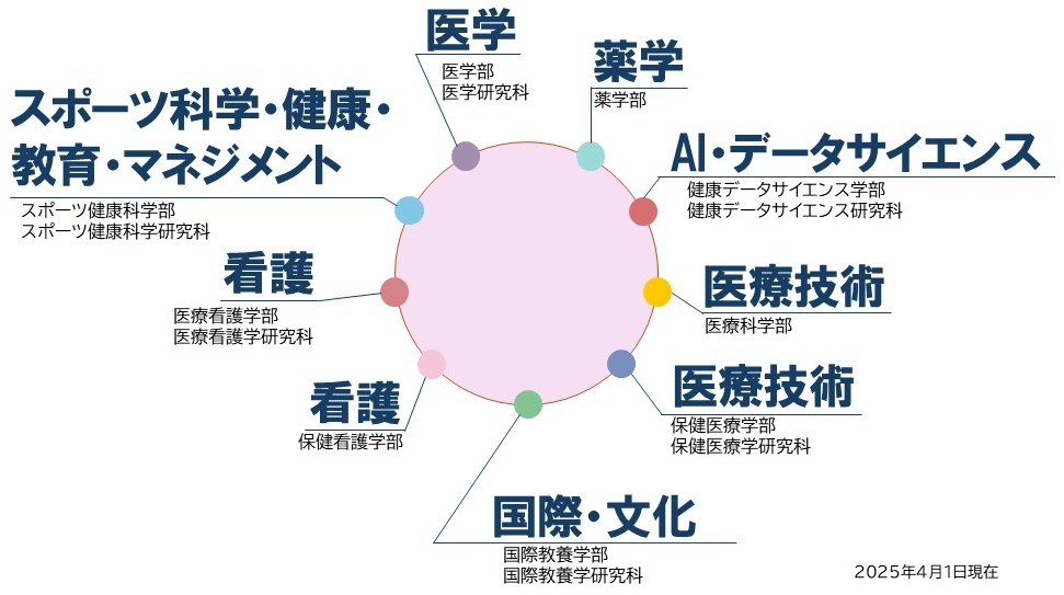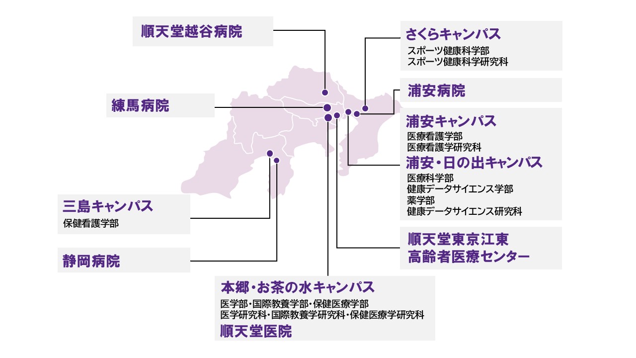 首都圏近郊に5キャンパス・6附属病院を擁する順天堂は、9学部6研究科から成る「健康総合大学」です。 医療、看護、保健、福祉、スポーツ、健康など、さまざまな研究分野の連携、協働体制を有しています。