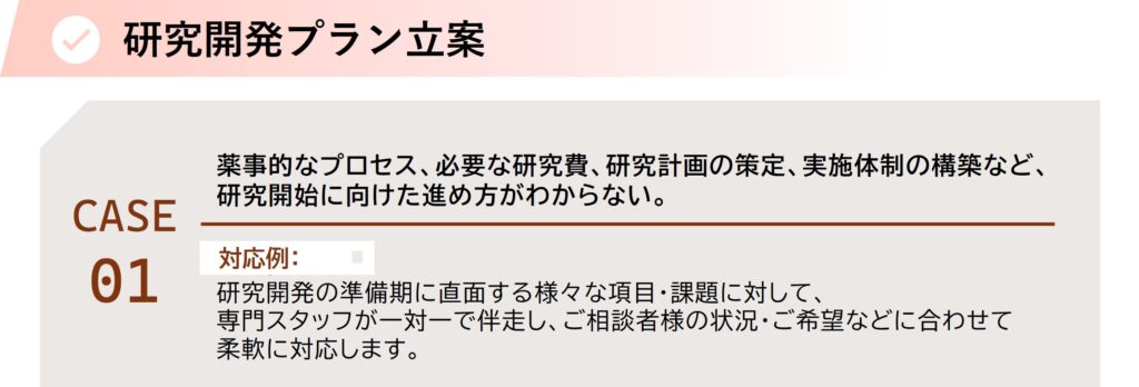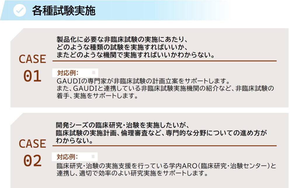 GAUDIは、各企業様の研究ステージにあわせて、ワンストップでシームレスな支援をご提供致します。