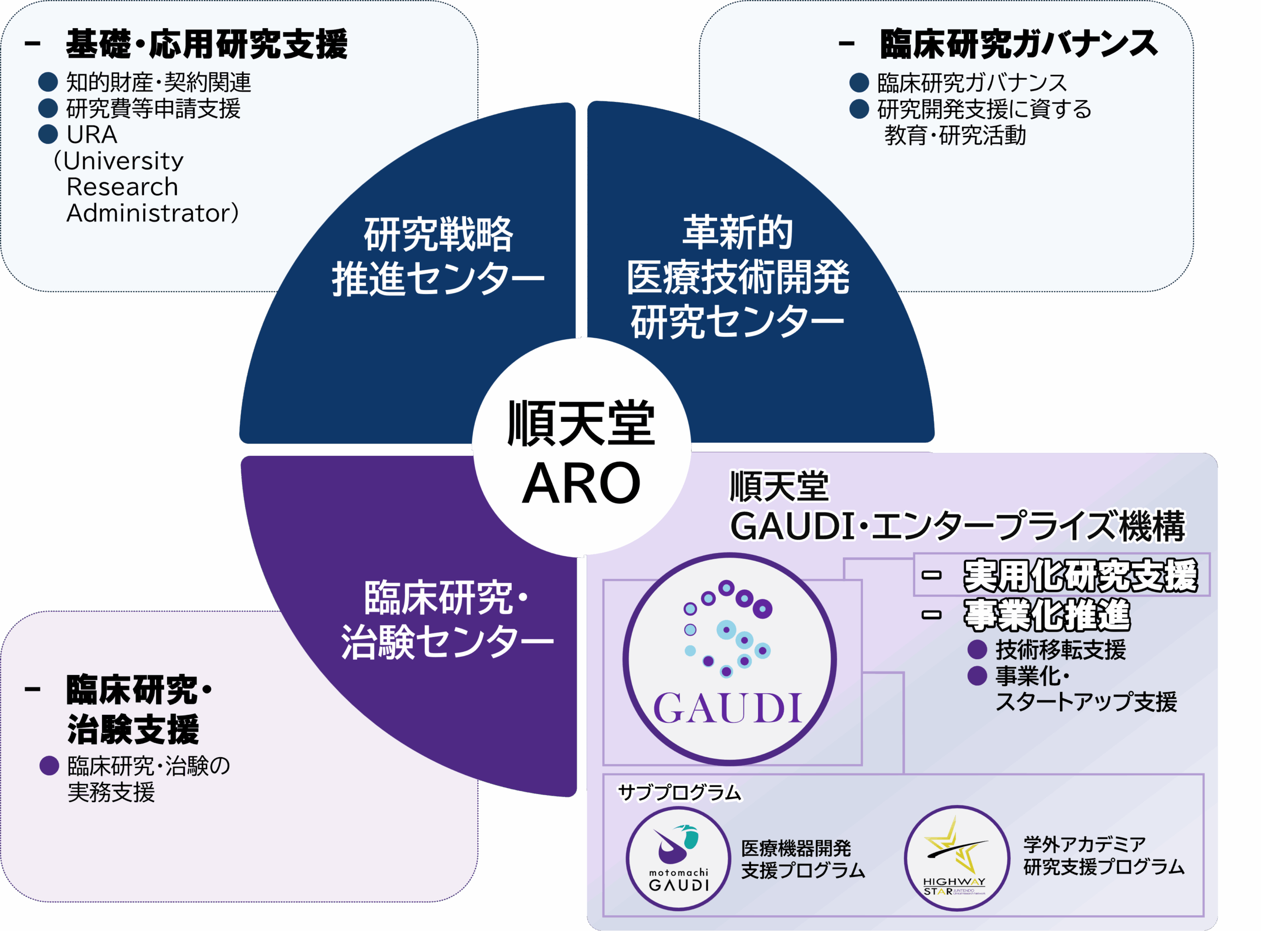 順天堂大学では、学内ARO(研究支援組織)が緊密に連携し、さまざまなモダリティ、ステージを対象とした支援を実施しています。